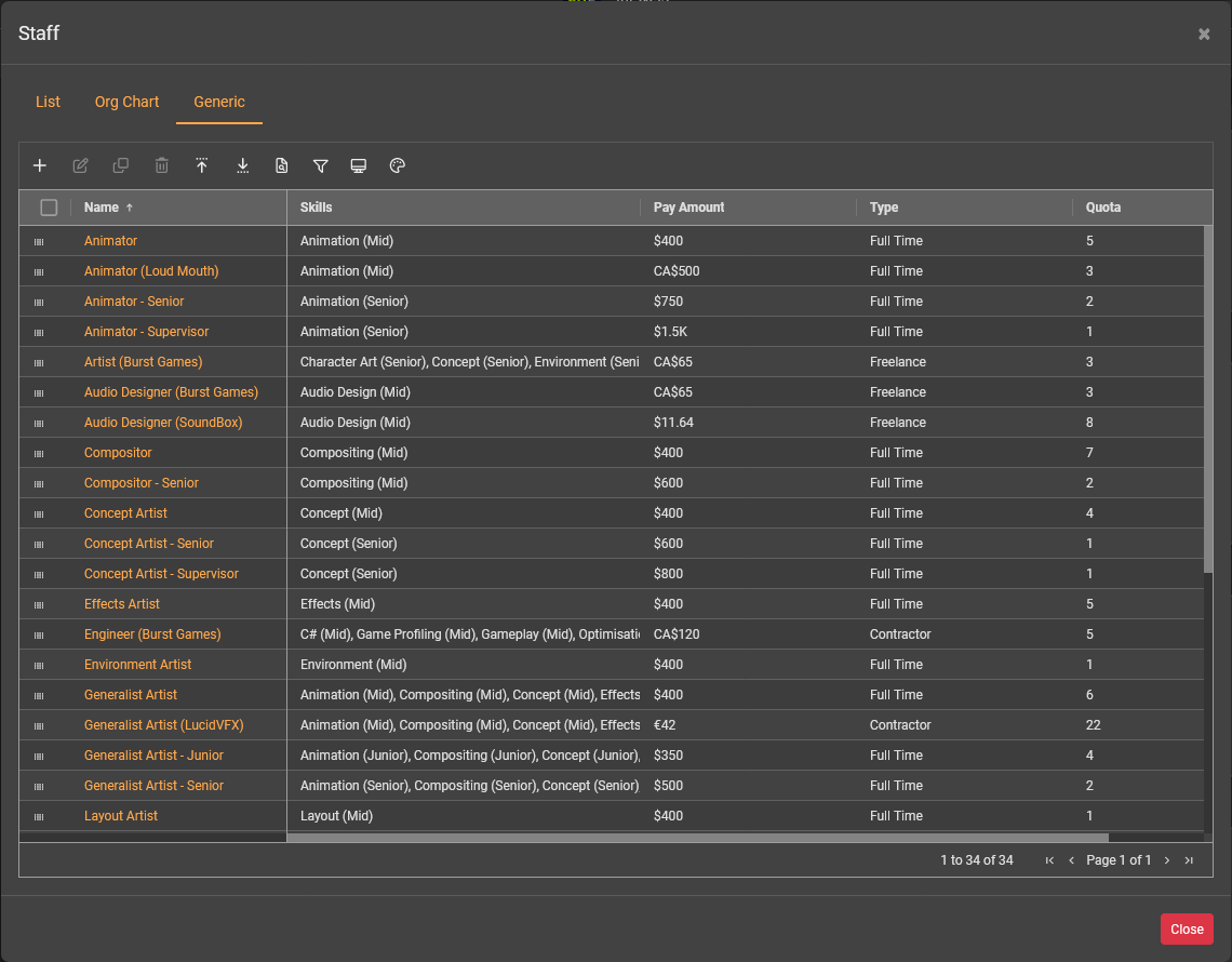 The Staff screen is where you can add, edit, duplicate, remove, import and export staff and generic in Projectal.