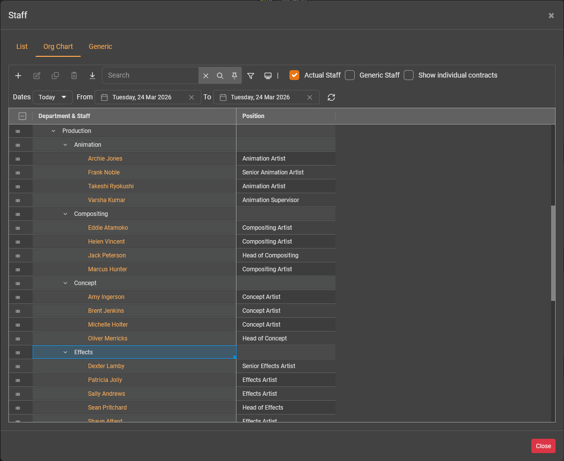 The Org Chart tab displays a list of all the actual staff and generic staff in their departments of your company.